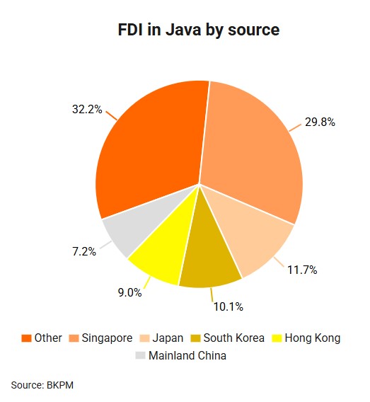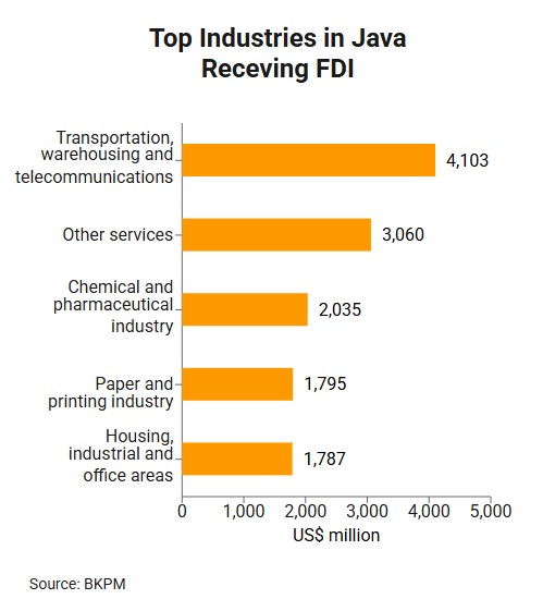 Foreign investments into Java are mainly directed towards transportation, warehousing and telecommunications (14.9% of total foreign investments into Java), chemical and pharmaceutical industry (7.41%), paper and printing industry (6.5%), and housing, industrial and office areas (6.5%).