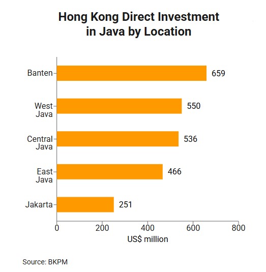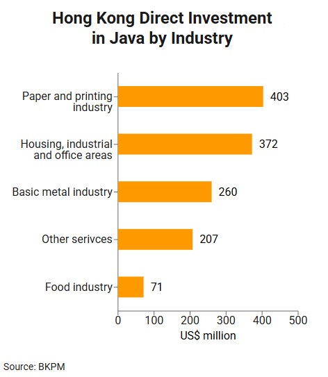 Specifically, investments from Hong Kong (US$2,464 million) are mainly in the paper and printing industry (16.4% of Hong Kong investments into Java), housing, industrial and office areas (15.1%), basic metal industry (10.5%), other services (8.4%), and the food industry (2.9%).