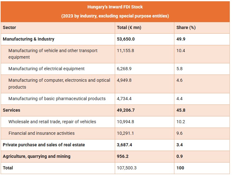 Hungary’s focus on the manufacturing sector has successfully attracted foreign investors. Between 2013 and 2023, the FDI stock in manufacturing grew at a compound annual growth rate of 11.7%, resulting in a threefold increase. Significant growth was observed in FDI within electrical equipment, chemicals, machinery, basic pharmaceuticals and vehicle manufacturing.
