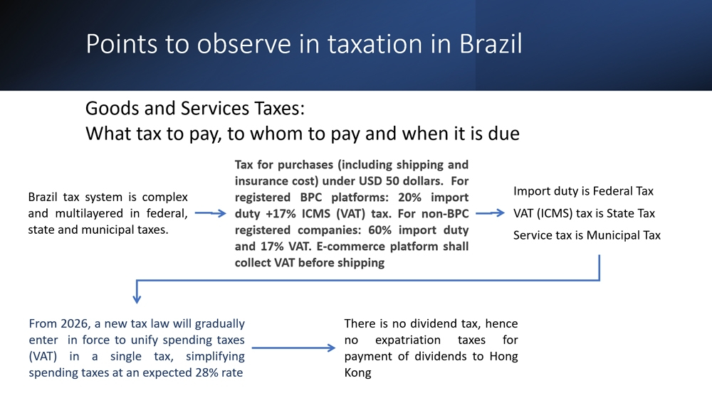 Hong Kong companies should note that the Brazilian government is striving to simplify its tax system. A key reform measure is to establish a new value‑added tax (VAT) system by consolidating five long‑existing taxes (industrial product tax, income tax, social integration tax, tax on circulation of goods and services, and service tax) into a VAT with a uniform rate of 28%. The new tax regime, expected to gradually take effect in 2026, will help attract investment and raise Brazil’s economic competitiveness. Brazil’s current tax system is complex, with multiple layers of taxes administered at the federal, provincial and municipal levels, such as a consumption tax for purchases of not more than US$50 (inclusive of shipping and insurance), a 20% import tariff and an over 17% tax on circulation of goods and services (ICMS).