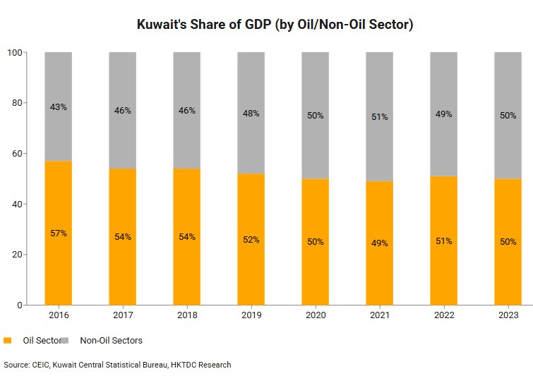 The heavy reliance on the oil industry exposes Kuwait’s economy to volatility from global oil price fluctuations. This prompted the launch in 2017 of the Kuwait Vision 2035 initiative, which was aimed at diversifying the economy, reducing oil dependency and stimulating private sector growth. The result has been a gradual rise in the importance of the non‑oil sector in the Kuwaiti economy. Between 2016 and 2023, the sector – which encompasses, among other activities, finance, construction and logistics – has grown from 43% to 50% of the country’s GDP.
