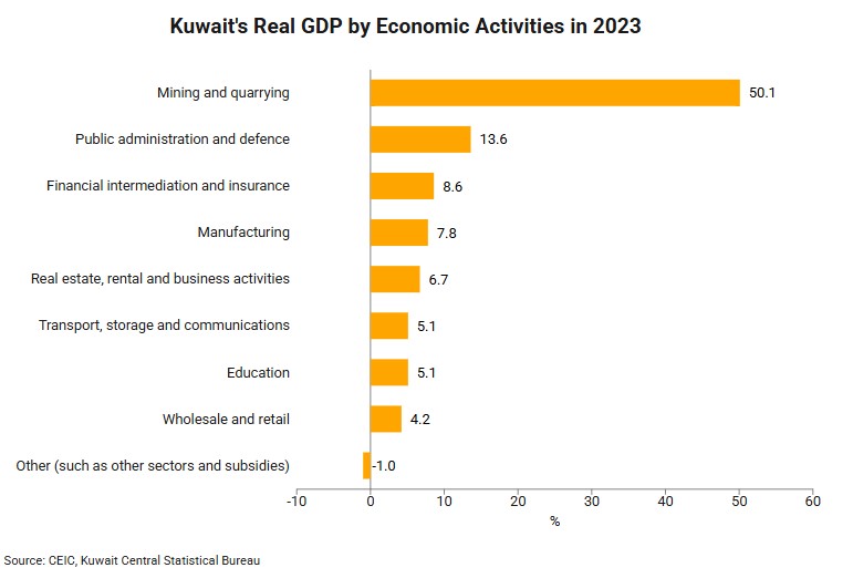In terms of economic activity by sector, mining and quarrying (which is the oil economy) accounts for 50.1% of total economic activity. Public administration and defence is the next biggest at 13.6%, reflecting significant government involvement in the non‑oil economy. The financial sector, the country’s most thriving industry, makes up 8.6% of the economy and is the largest private sector component within the non‑oil economy.