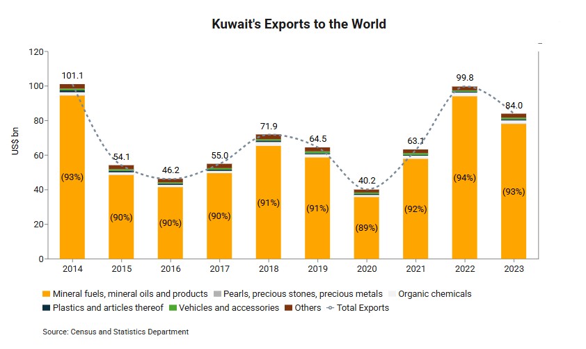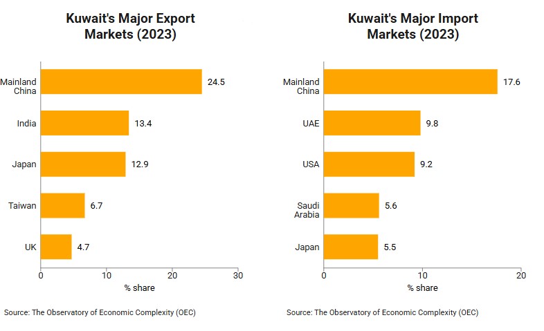 Despite the growth of the non‑oil sector, crude oil and refined oil products continue to dominate Kuwait’s exports, making up about 90% of them. Mainland China was Kuwait’s largest trading partner in 2023, accounting for about 20% of the country’s total trade.