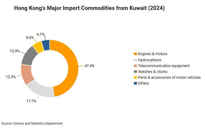 In terms of Hong Kong’s trading relationships, Kuwait ranked fifth among GCC states in 2024. Bilateral trade between Hong Kong and Kuwait has rebounded from the Covid-19 pandemic. In 2024, bilateral trade between Hong Kong and Kuwait was worth US$240 m, up 21.2% from the year before. Telecommunication equipment makes up 51.3% of exports from Hong Kong to Kuwait, accounting for US$83 m. The next biggest sector is jewellery (10.8%, US$17 m), followed by watches & clocks (6.6%, US$11 m). Engines and motors are Hong Kong’s major source of imports from Kuwait, amounting to US$37 m , or 47.4% of the total. followed by hydrocarbons (17.7%, US$14 m) and telecommunication equipment (12.3%, US$10 m).