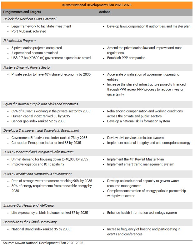 The Kuwait National Development Plan (KNDP) sets out the programmes and policies designed to push the nation towards its 2035 vision. It focuses on increasing the involvement of the private sector in all sectors of the economy.