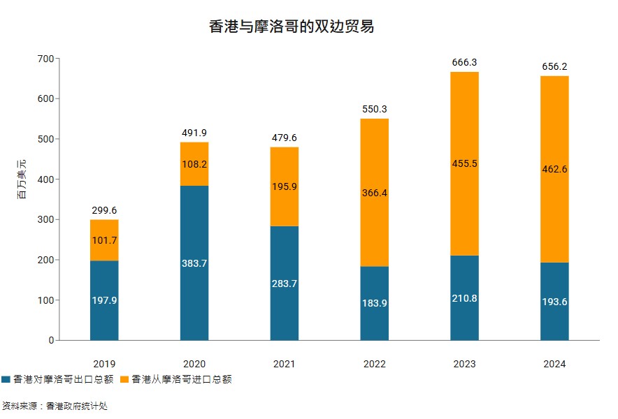近年,香港与摩洛哥的贸易增长迅速。2024年,两地双边贸易额约6.6亿美元,自2019年以来复合年增长率达17.0%,远高于同期香港与世界各国贸易总额的2.6%增长率。