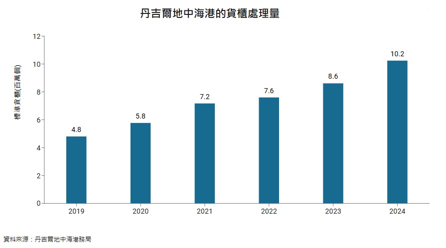 丹吉爾地中海港連通70個經濟體超過180個港口。船隻從該港口出發,可在5天內抵達西歐大多數港口,10天抵達美國,20天抵達亞太地區,包括香港。8