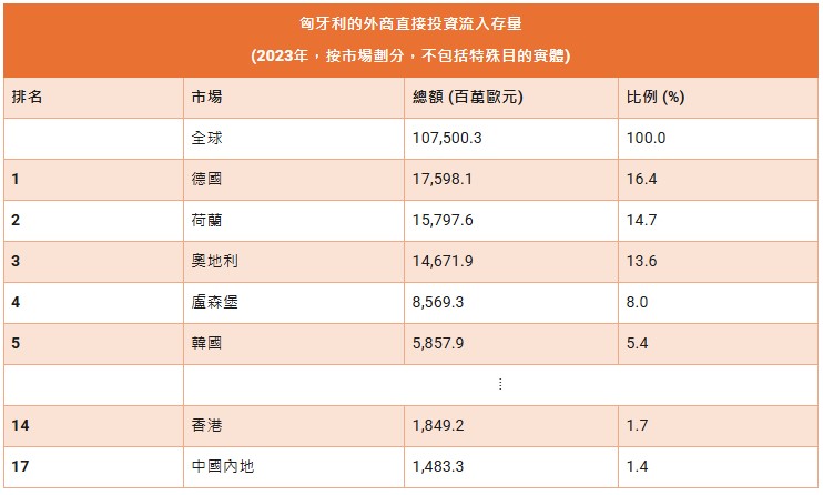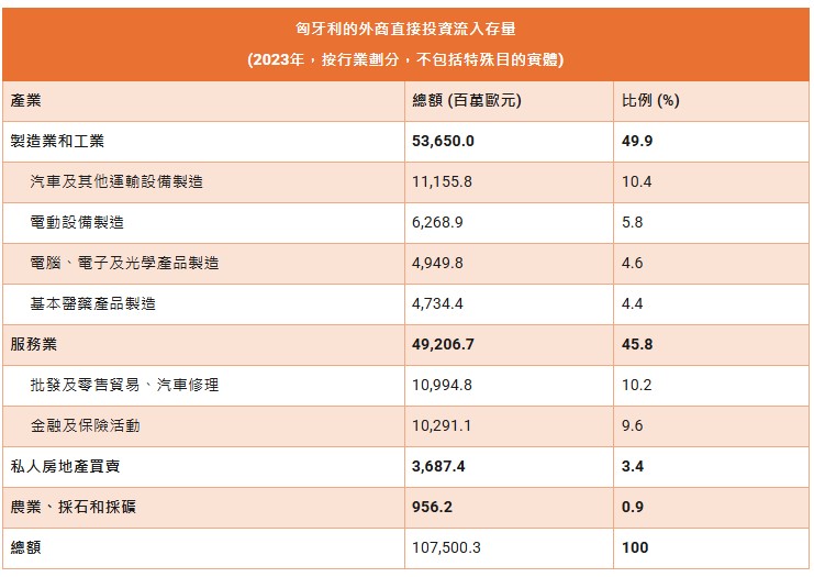 2023年,匈牙利的外商直接投資總額約為1,075億歐元。投資者主要來自歐洲國家,佔外商直接投資總額86%。匈牙利是歐洲其中一個汽車製造中心,吸引了大量外商直接投資設廠。2023年,汽車製造業佔匈牙利外商直接投資存量的10.4%[3]。由於匈牙利政府高度重視在國內發展出完整的電動車價值鏈,預計該國未來數年將會吸引更多與電動車相關的投資。
