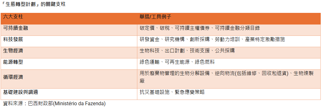 在該框架和新的可持續發展目標下,巴西啟動了多項計劃,從不同方向加快步伐,其中之一是2023年推出的「生態轉型計劃」(Plano de Transformação Ecológica)。該計劃又稱為「新巴西」(Novo Brasil)計劃,旨在透過整合財政改革和科技創新,提高綠色生產力,推動共融和可持續的經濟發展。